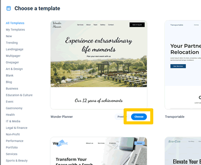 Scegli il template più adatto al tuo sito tra le oltre 140 proposto tutte user-friendly e adatte a table e smartphone, clicca sul pulsante blu "Choose". E puoi cambiarlo quando vuoi!