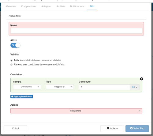 cliccare sul bottone "Nuovo Filtro" e compilare i campi del form.