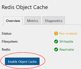 successivamente cliccare su "ON" per attivare la Cache ad Oggetti Redis.